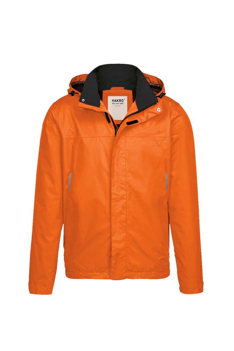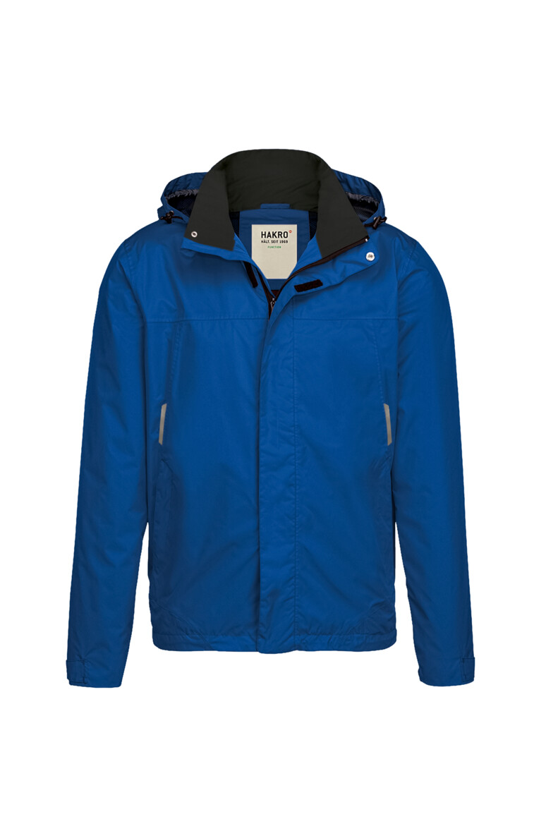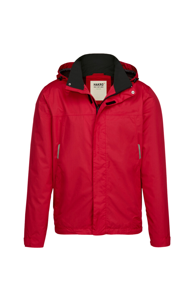 Leichte, funktionelle Regenjacke mit wasser- und winddichtem Obermaterial sowie getapten Nähten, klimaregulierendem Netz-Innenfutter, angenehm weichem Fleece an der Krageninnenseite, einer im Kragen integrierbaren und weitenverstellbaren Kapuze, verschließbarer Brustinnentasche, hochwertigem Frontreißverschluss mit doppelter Windschutzpatte und Seitentaschen mit Reißverschluss. Alle Reißverschlüsse von YKK®. Der Saumabschluss mit verlängertem, abgerundetem Rückenteil ist mit einem Tunnelkordelzug mit Stoppern in der Weite verstellbar, weitenverstellbare Ärmelbündchen mit Klettband zum stufenlosen Regulieren und Reflexapplikationen für verbesserte Sichtbarkeit. Hergestellt aus strapazierfähigem, wasser- und winddichtem, atmungsaktivem Obermaterial aus 2-Lagen-Laminat mit TRIACTIVE® PRO Technologie für maximale und zuverlässige Wasserdichte. Gewebtes HAKRO Necklabel aus hochwertigem Kettsatin mit weichen, ultraschallgeschnittenen Bandkanten für höchsten Tragekomfort und gewebtes HAKRO Flaglabel an der linken Seitennaht.